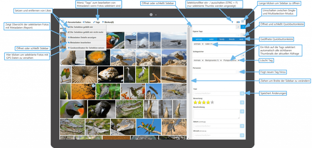 Eine Übersicht der Benutzeroberfläche mit vielen Screenshots findet sich hier: PicApport – Navigator (Webinterface)