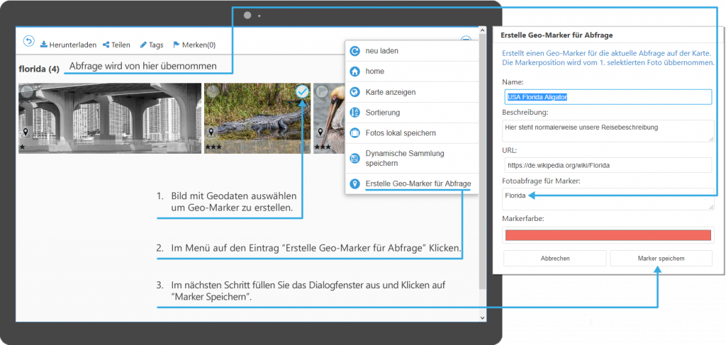 Hiermit kann man z.B.- Alle Fotos einer Urlaubsreise über den Marker auf der Karte aufrufen