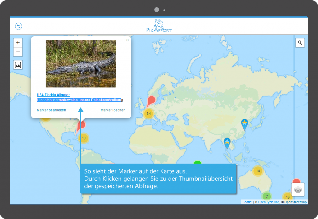 - Beispiel (einfach auf die Marker klicken): Onlinedemo starten https://onlinedemo.picapport.de/picapport und dann auf die Weltkugel neben dem Hilfebutton klicken