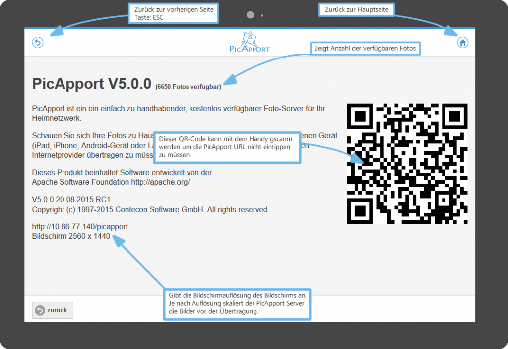 Die About-Seite (#about) Neben der aktuell auf dem Server verfügbaren Anzahl Fotos ist hier auch ein praktischer QR-Code zur Weitergabe der PicApport Server URL an ein anderes Handy untergebracht.Einfach mit einer entsprechenden App scannen.