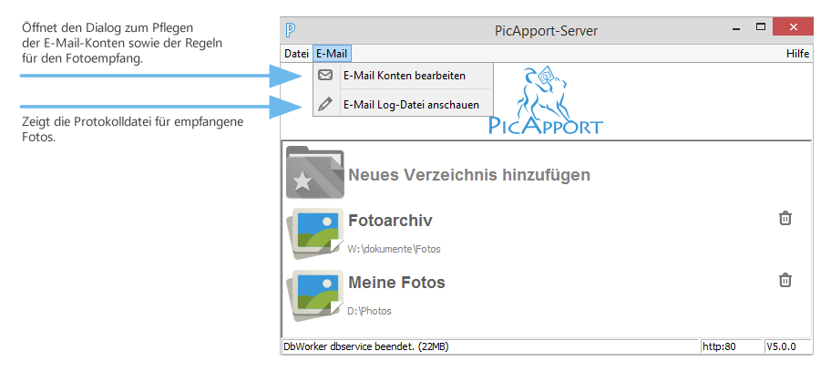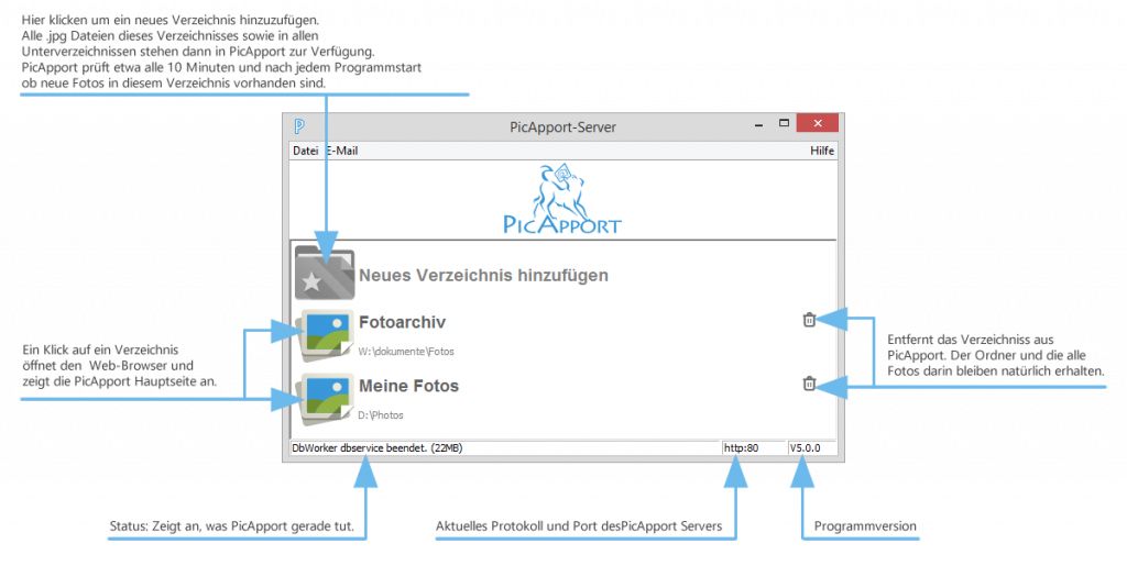 der konfigurierten Verzeichnisse freigegeben. Werden neue Unterverzeichnisse auf dem Server angelegt, erkennt dies der PicApport-Server automatisch und gibt die Fotos frei.